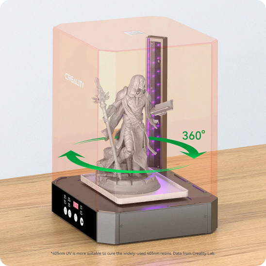 La rotación de la plataforma asegura una solidificación uniforme y rápida de la superficie del modelo, con una potente exposición LED UV de 405 nm.