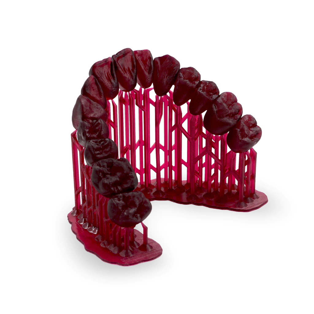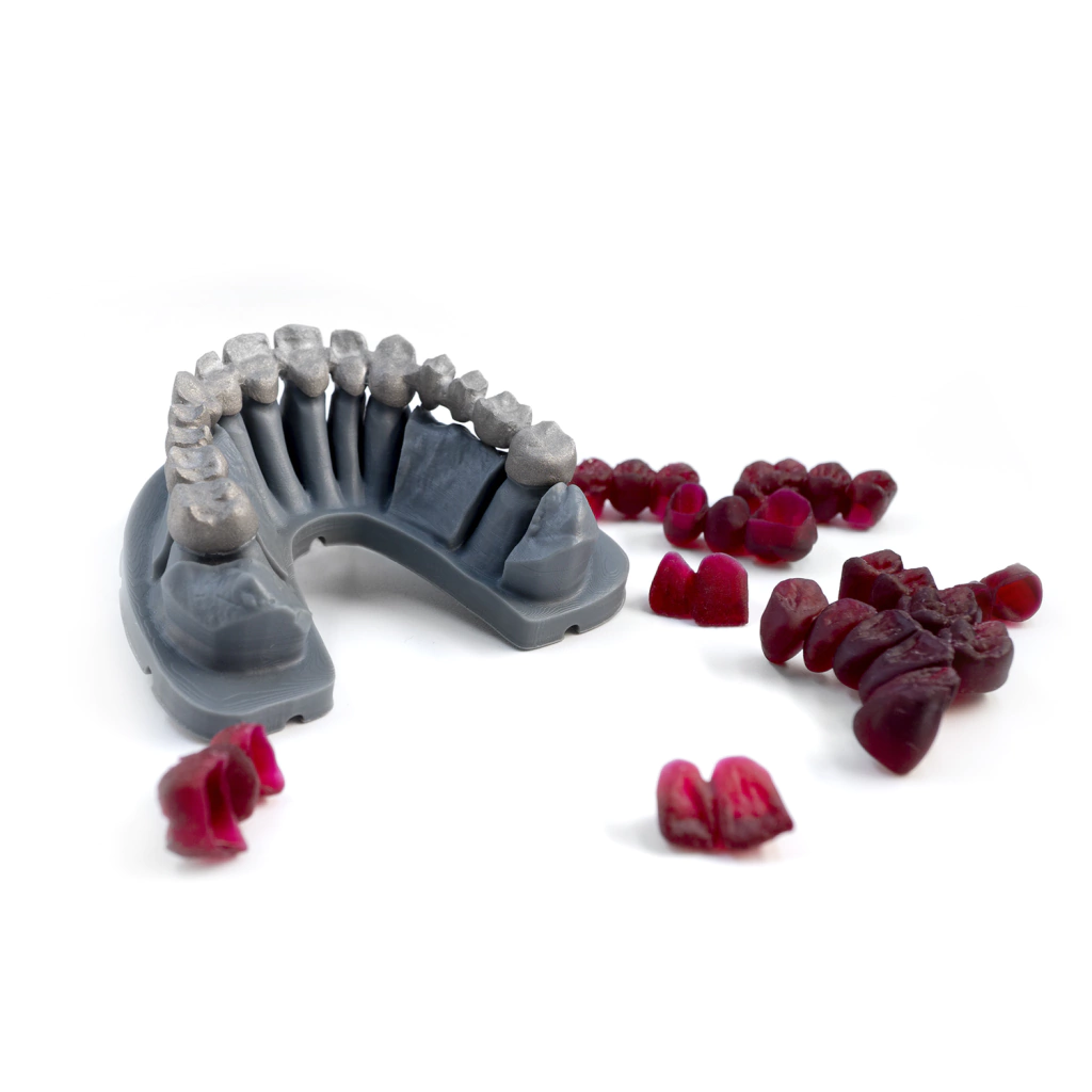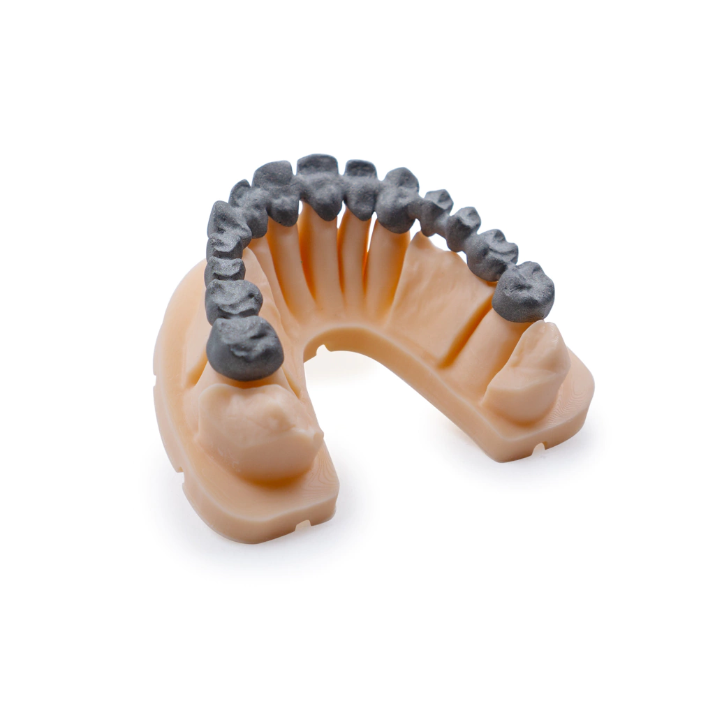 La Resina 3D HARZLabs Cast es una excelente opción para el colado directo de coronas y puentes de metal y cerámica prensada. Su contenido de cenizas cero (menos del 0,1 %) y sus propiedades termoplásticas hacen que la resina sea adecuada para el colado directo. La resina ha sido diseñada para quemarse rápidamente a altas temperaturas para reducir el tiempo de producción. Recomendamos utilizar material de revestimiento para colado aglomerado con fosfato que pueda soportar plásticos a altas temperaturas para garantizar la mejor calidad de colado. Su ligero olor y la ausencia de monómeros peligrosos permiten su uso incluso en un laboratorio pequeño.