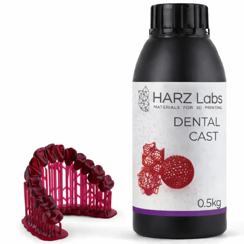 Resina 3D HARZLabs Cast diseñada para la impresión de modelos, utilizado para colada directa y cerámica prensada. Su contenido cero de cenizas y su preparación para el uso en ciclos de choque permiten obtener coladas de alta calidad. Cumple con los requisitos de la norma ISO 10993.