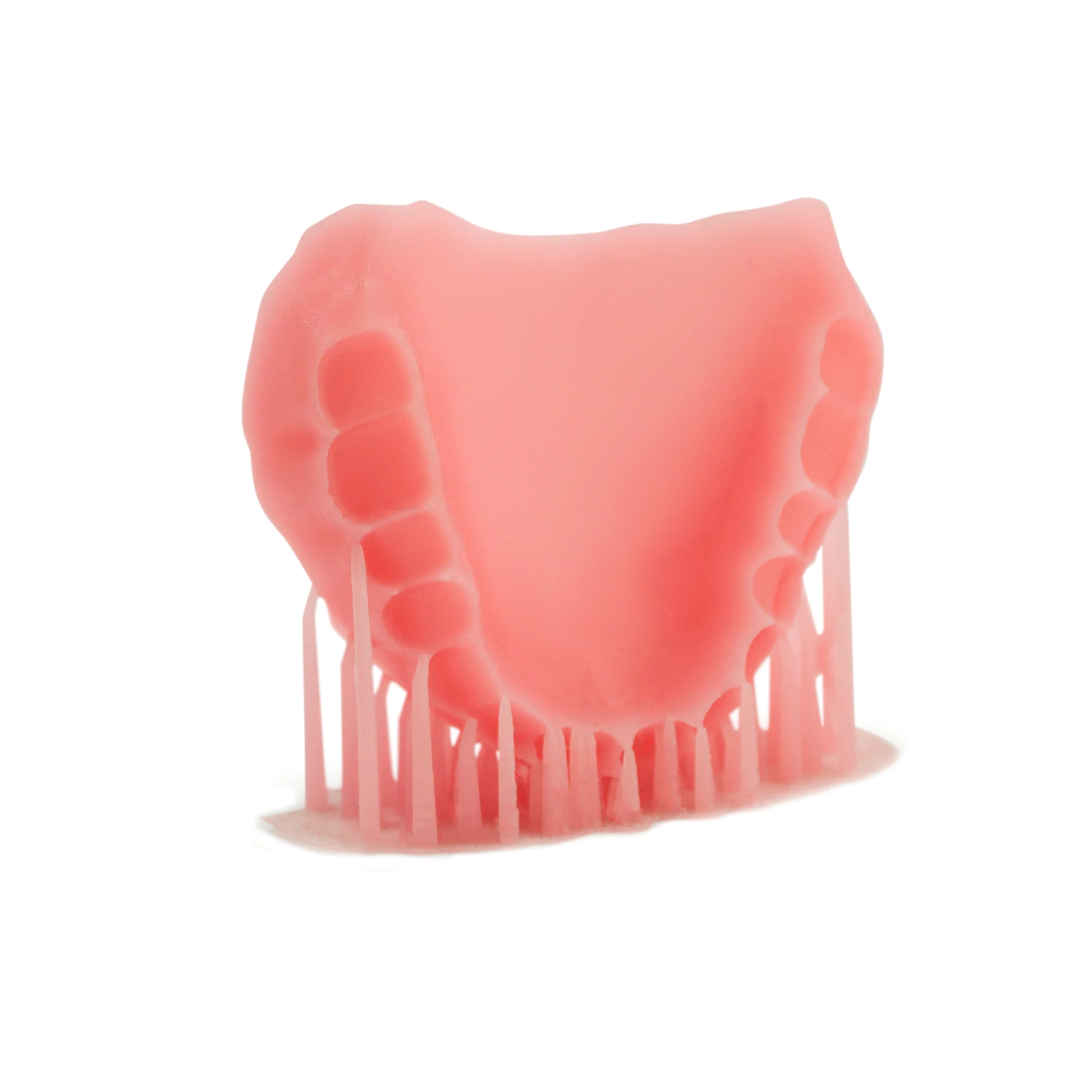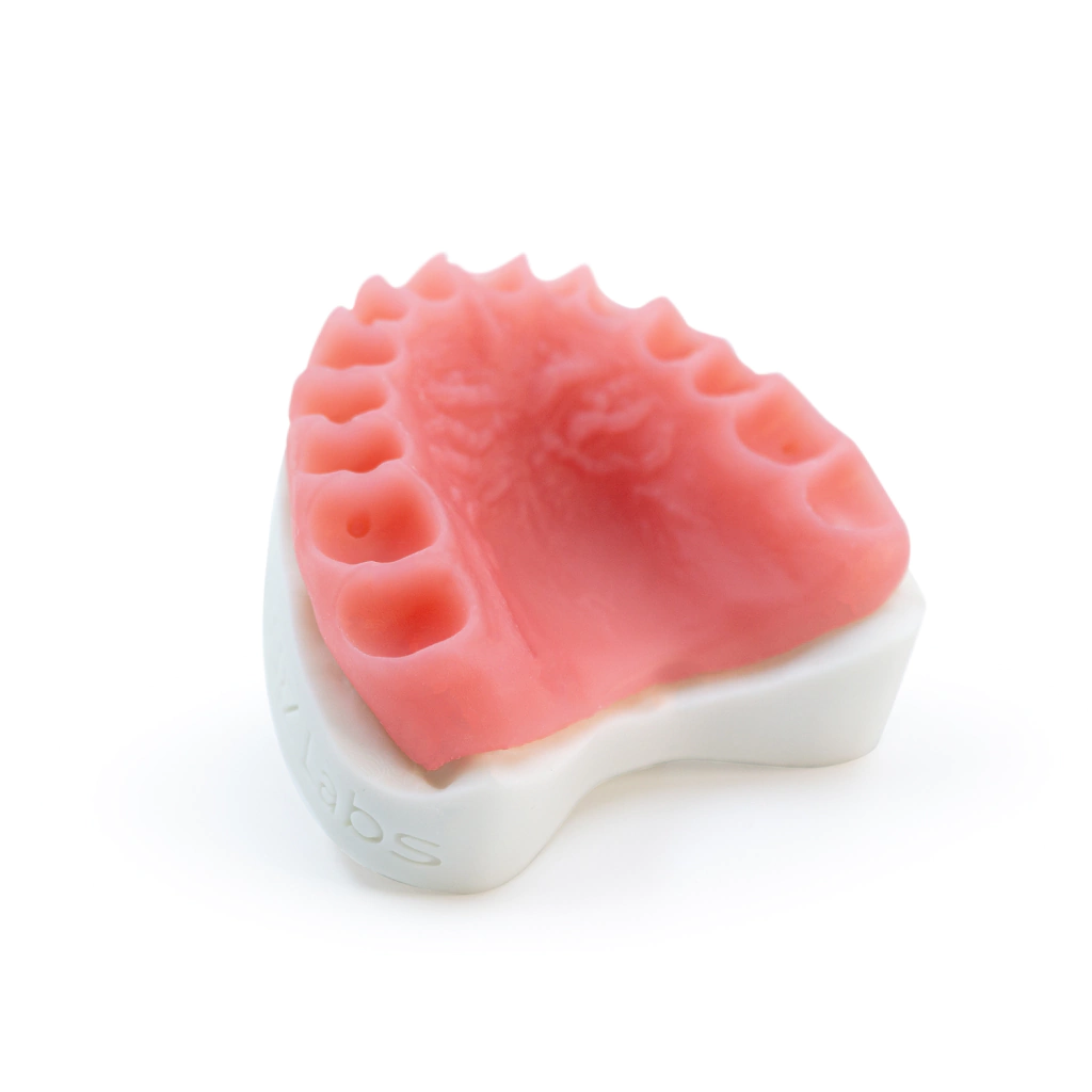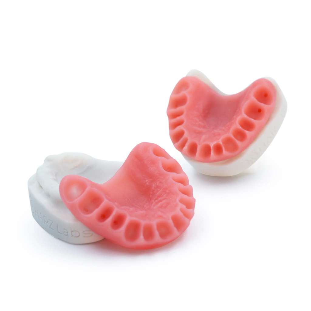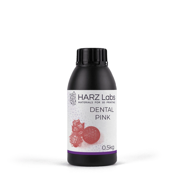Resina 3D HARZLabs Pink diseñado para la impresión de modelos de bases de prótesis dentales temporales en color rosa. Resistente, brillante y estable a las deformaciones. Cumple con los requisitos de la norma ISO 10993.